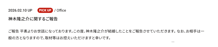 神木隆之介さんは2026年2月10日、自身の公式サイトやSNSを通じて、一般女性との結婚を正式に発表しました。