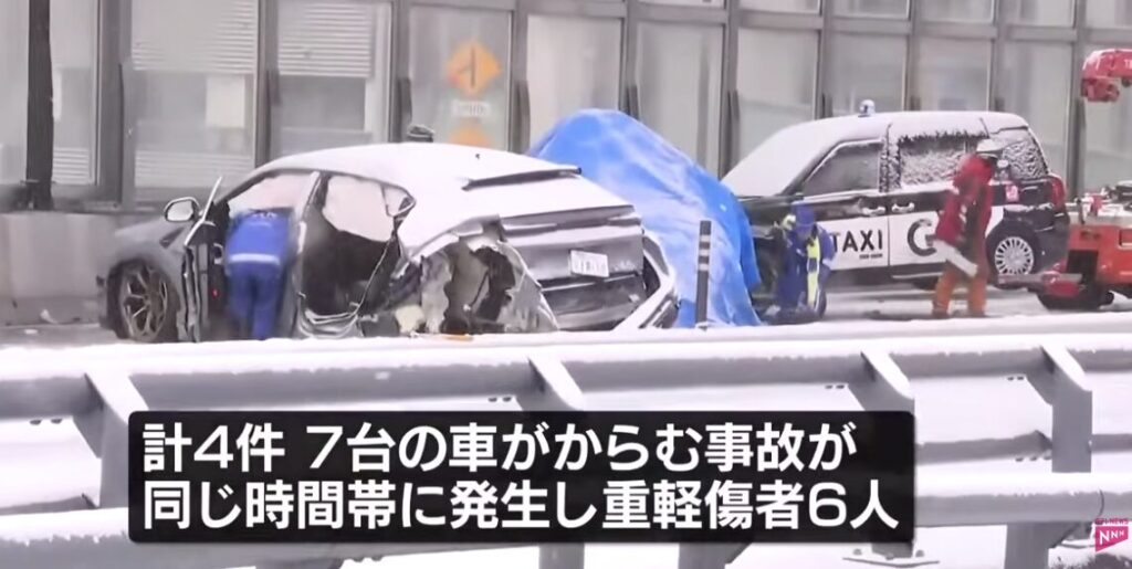 雪が降って路面がツルツルの中で起きた多重事故。