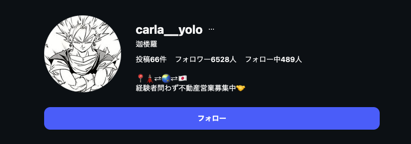 プロフィールに「経験者問わず不動産営業募集中」とあり、フォロワー6.5K超。