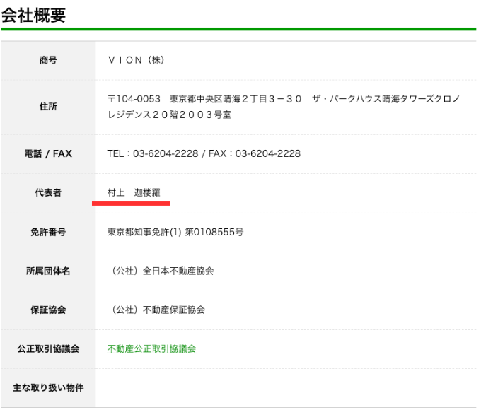 実際に調べたところ、東京都中央区に「VION株式会社」という不動産会社が存在し、代表取締役として“村上迦楼羅”という同名の人物が登録されていることが確認できました。