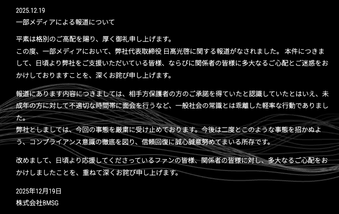 今回の報道を受け、SKY-HIが代表を務める BMSG は、2025年12月19日に公式サイトで謝罪文を発表しました。内容としては、報道があったこと自体を認めたうえで、日頃から応援しているファンや関係者に対して謝罪するものとなっています。